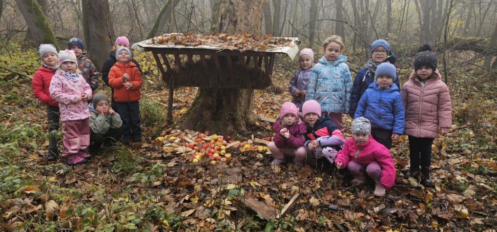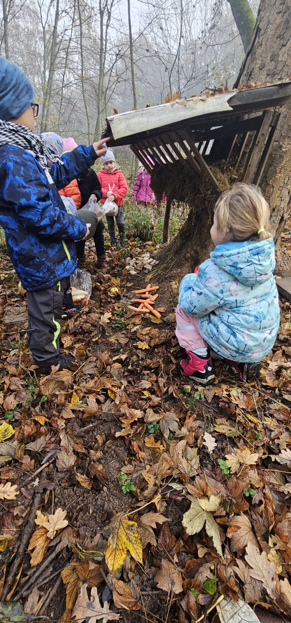 Společně s dětmi jsme donesli zvířátkům ke krmelci dobroty. Cestou jsme sledovali stopy zvířat a určovali jsme jejich názvy.