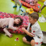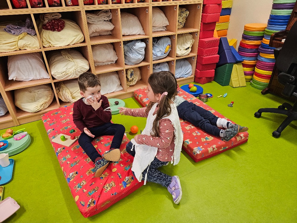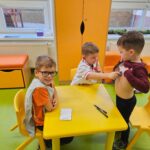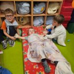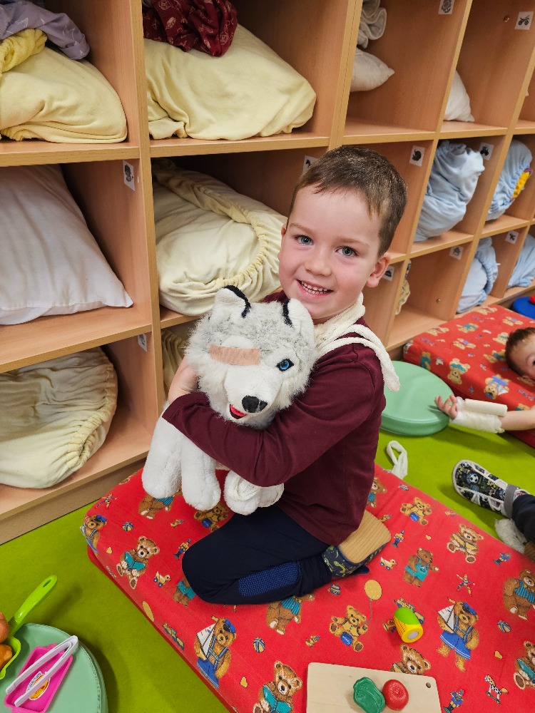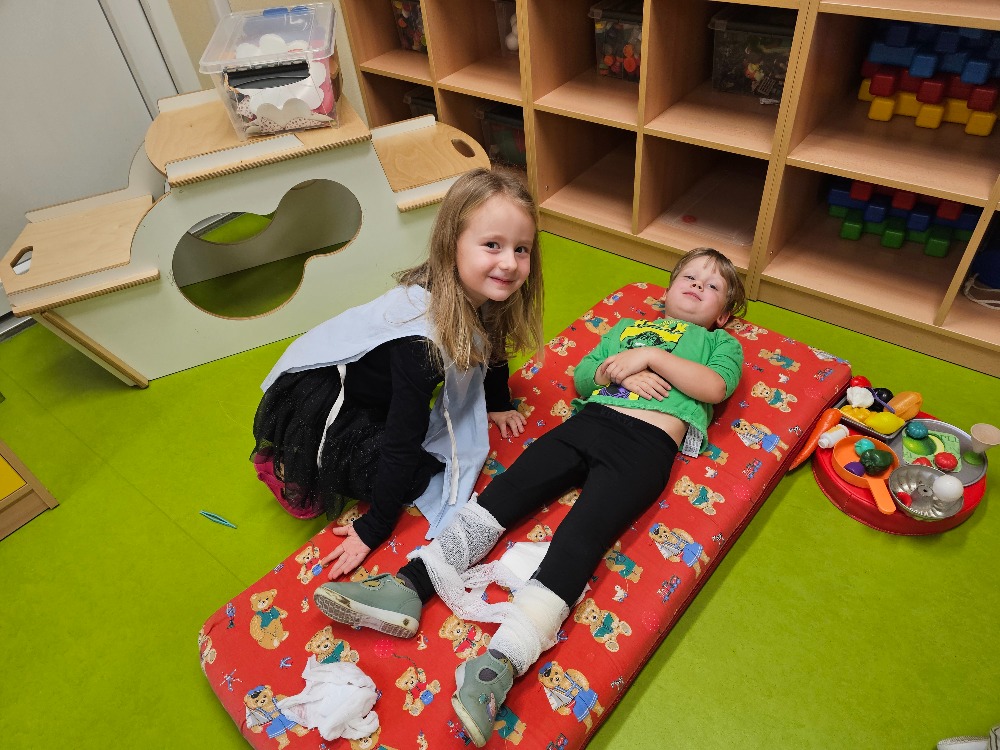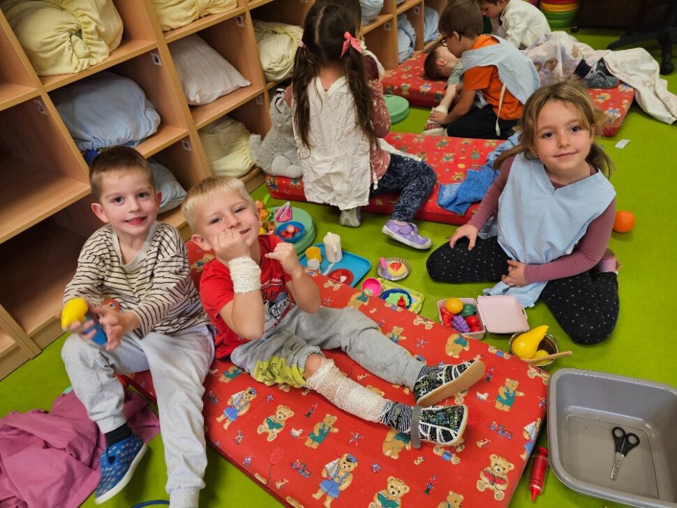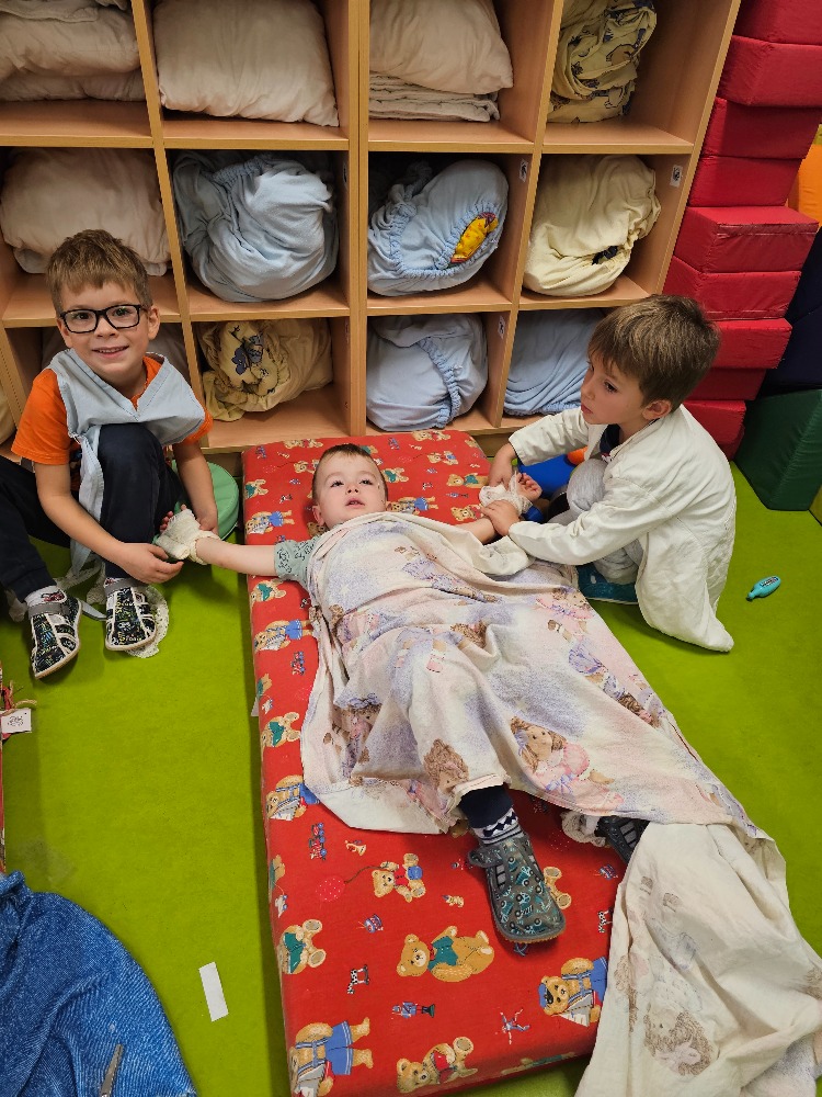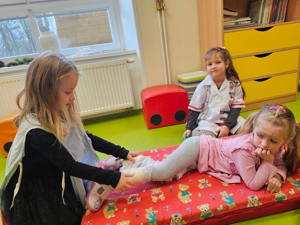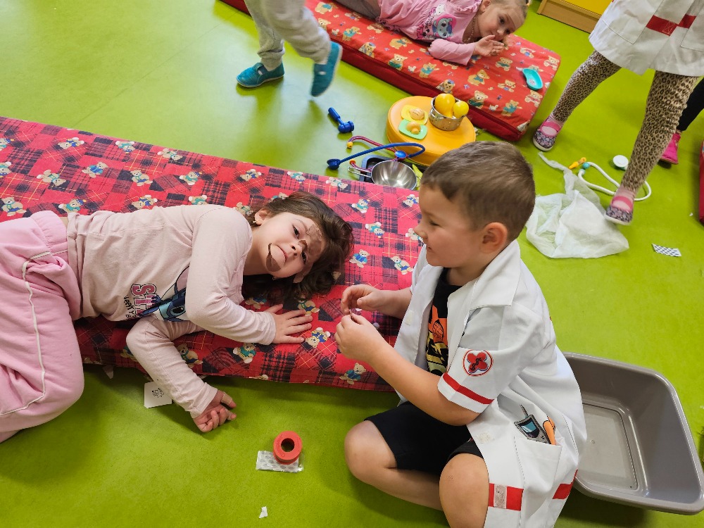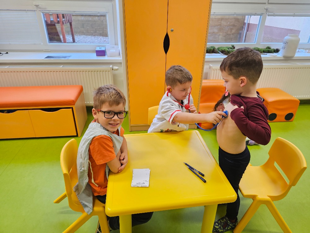 Dnes se naše školka proměnila v nemocnici. Děti se převlékly do kostýmů doktorů, sestřiček a pacientů. Používaly různé nástroje, zavazovaly si zlomeniny a staraly se o pacienty. Hra se jim moc líbila.