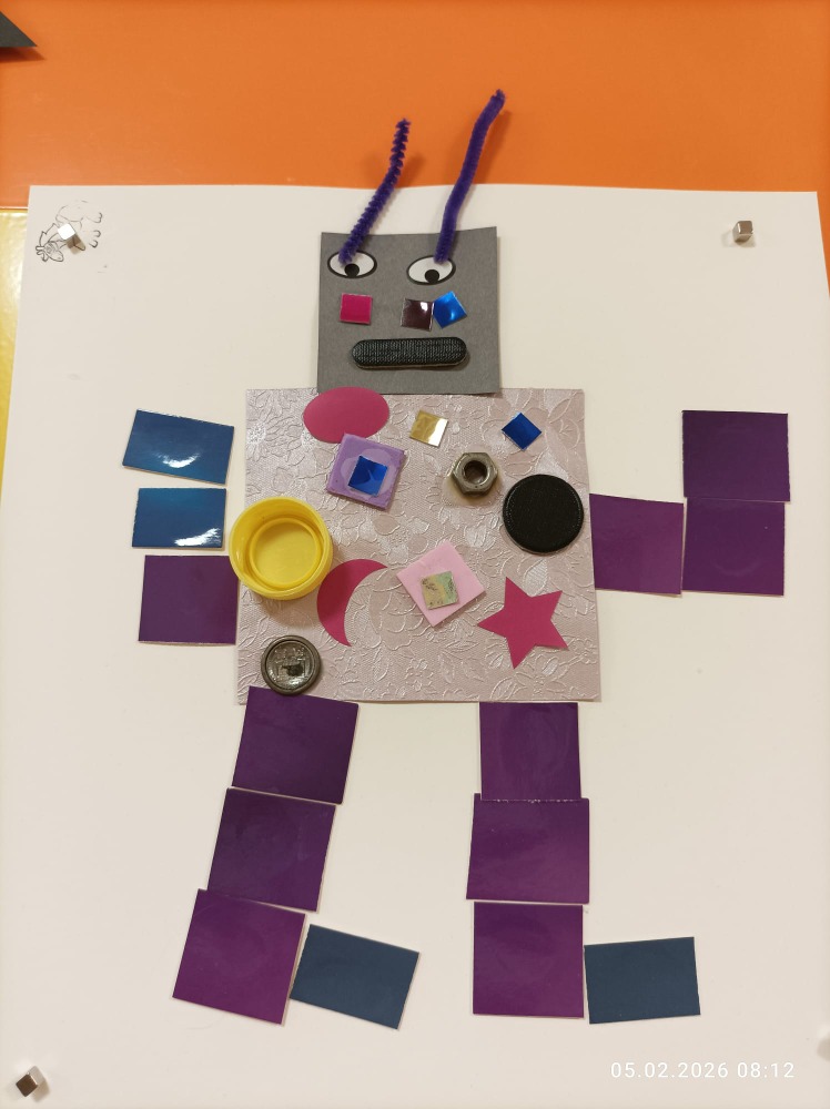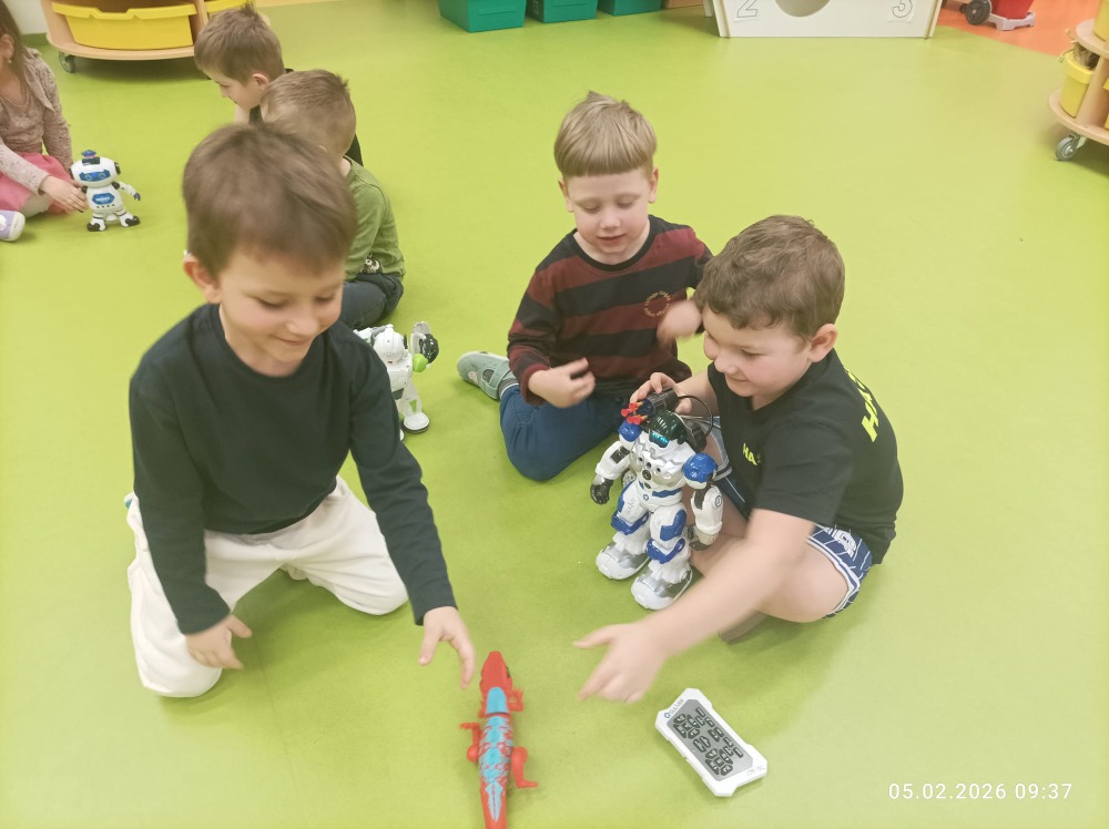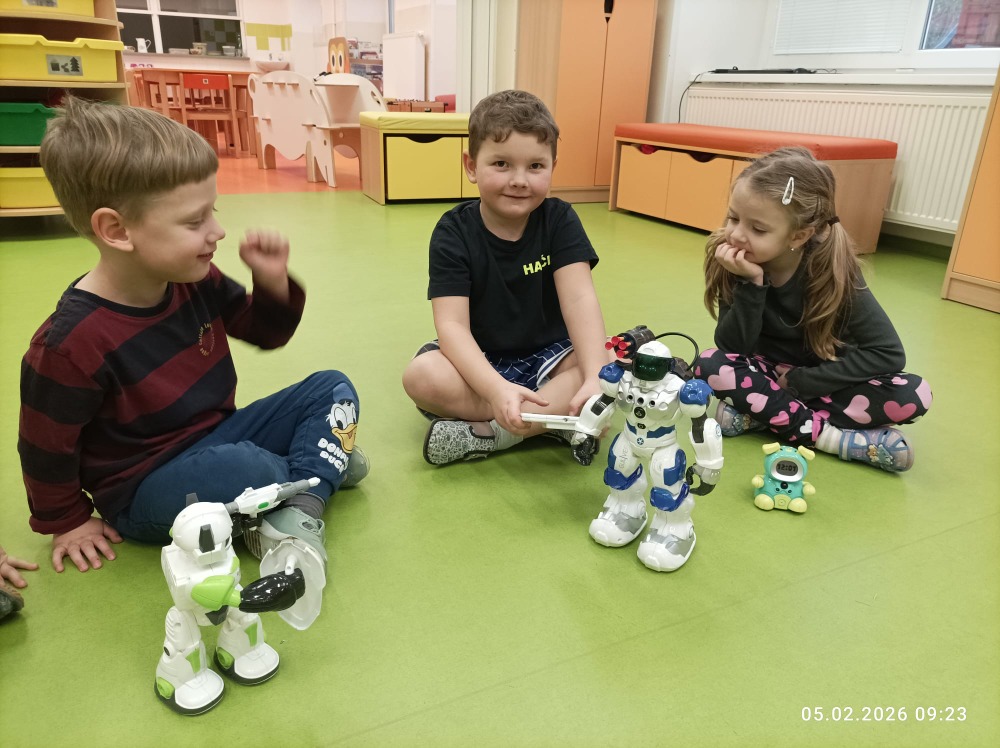 Děti se dozvěděly, jak vzniklo slovo robot, z čeho se skládá, jaké má využití a čím je prospěšný člověku. Děti stavěly roboty z různých geometrických tvarů na plochu, z různých stavebnic do prostoru, napodobovaly je zvuky i pohybem. Z domova si přinesly své robotické hračky, s kterými si společně hrály.