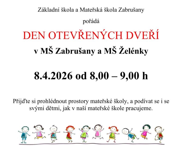 DEN OTEVŘENÝCH DVEŘÍ v MŠ Zabrušany a MŠ Želénky 8.4.2026 od 8,00 – 9,00 h Den otevřených dveří 2026